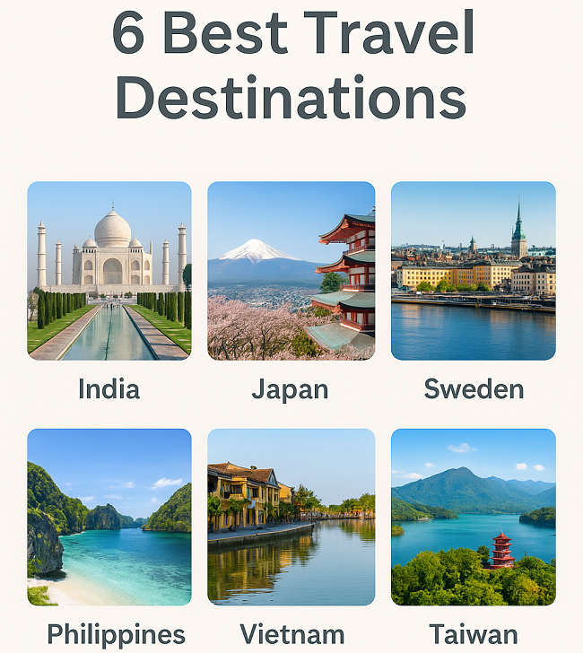 Traveling through the top destinations in India, Japan, Sweden, the Philippines, Vietnam, and Taiwan reveals the world’s incredible diversity. Each country offers unique experiences—from India’s majestic Taj Mahal and serene Kerala backwaters to Japan’s cherry blossoms, Taiwan’s Sun Moon Lake, Sweden’s medieval towns, the Philippines’ pristine beaches, and Vietnam’s breathtaking rice terraces. These destinations provide a perfect mix of culture, history, nature, and cuisine, creating memories that last a lifetime.
